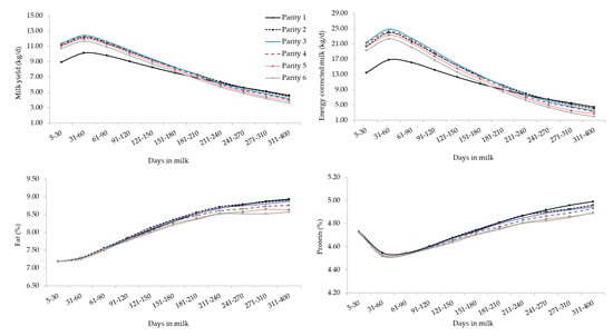 The interaction between the effect of parity and stage of lactation for all studied traits is depicted in Figure 2, where parity-specific curves are presented. First- and later-parities buffaloes were clustered, displaying significant differences in terms of MY and ECM for most of the lactation. These results agreed with findings on Brazilian Murrah [18] and Mediterranean buffaloes [34] and other ruminants. In fact, MY tends to increase from the early productive life and then decreases in old lactating buffaloes. Supporting this, in the present study, MY on average increased until third parity and then slightly reduced. The decrease of MY could be attributed to the combined effects of aging of tissues and of the suboptimal health of the mammary gland, as suggested by the progressive increase of SCS as parity increased (Figure 2). The MY persistency was similar from second to sixth parity (Figure 2) and, confirming literature [16,35], primiparous buffaloes showed greater MY persistency than multiparous (Figure 2). This may be partly due to the voluntary delay of insemination at the end of lactation in primiparous to perform OBSM.