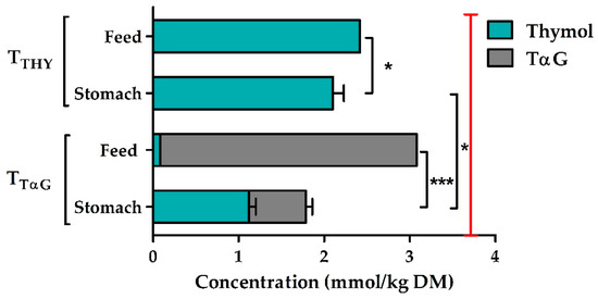 The analytically verified total thymol concentration measured in the feeds differed from the intended dose of 3.7 mmol/kg DM. TTHY feeds contained 2.4 mmol thymol/kg DM, while TTαG feeds included 3.0 mmol TαG /kg DM and 0.08 mmol thymol/kg DM (Figure 1). Further calculations were made with these actual concentrations. The thymol concentration in the stomach contents of TTHY pigs was 13% lower than in the feed (on DM basis) (p = 0.031).