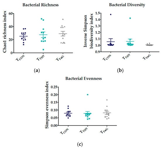 The alpha diversity indices of the microbial community composition on the genus level in the small intestinal contents of the last 25% of the total length of piglets fed a basal diet (TCON) supplemented with 3.7 mmol/kg DM thymol (TTHY) or thymol α-D-glucopyranoside (TTαG) (a) bacterial richness (Chao1 richness index); (b) bacterial diversity (Reciprocal Simpson biodiversity index; and (c) bacterial evenness (Simpson evenness index). The data are represented as scatter plots: each dot represents a piglet, together with the mean (middle line) and SEM (whiskers).