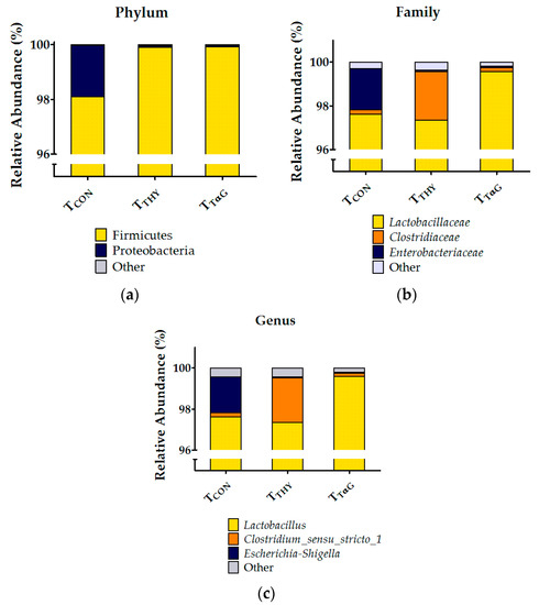 The cumulated relative abundances of the identified taxa at the (a) phylum, (b) family, and (c) genus levels in the small intestinal contents of the last 25% of the total length of piglets fed a basal diet (TCON) supplemented with 3.7 mmol/kg DM thymol (TTHY) or thymol α-D-glucopyranoside (TTαG).