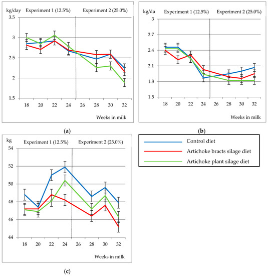 Changes in milk yield (a), fat corrected milk (b) and average body weight (c) due to diet throughout the lactation in experiments 1 and 2.
