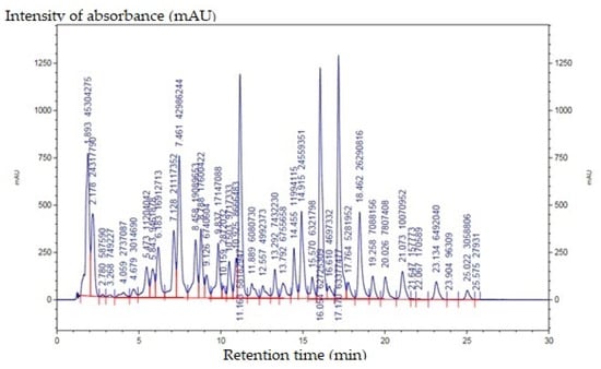 Hungarian red sweet pepper powder (in 1–5 g) was applied in triplicates to extract carotenoids and extraction was carried out with 50 mL dichloroethane:acetone:methanol as solvent mixture in 2:2:1 ratio. Next, the mixture was mixed in an ultrasonic water bath for 30 min, then filtered through a filter paper (Munktell-292). Afterwards, a 0.22 µm PTFE syringe filter (TPP Techno Plastic Products AG, Trasadingen, Switzerland) was used for further purification. Filtered residue was vaporized at 40 °C at 0.2 bar and then filtrate was solved in an high-performance liquid chromatographic (HPLC) pigment reagent (isopropanol:ACN:methanol in 55:35:10 proportion) (Merck, Darmstadt, Germany) [50]. A HPLC separation was performed on Phenomenex Kinetex® column (2.6 µm, XB-C18, 100 Å, 100 × 4.6 mm) (Phenomenex, Torrance, CA, USA) with 2 gradient elutions: A: 11% methanol, B: isopropanol:ACN:methanol (55:35:10 V/V/V%) mixture. Gradient elution steps were the following: 0–3 min solvent A 100%; 15–20 min solvent A 20%; 25–45 min solvent B 100%; 48–50 min solvent A 100%. Flow rate was 0.6 mL/min and Diode Array Detector (DAD) detection was carried out on 460 nm and 350 nm. Samples were injected in 10 µL and after DAD detection was applied at 460 nm and 350 nm. HPLC profile is shown in Figure 1. Carotenoid compounds with the greatest areas were identified and involved in Table 1.