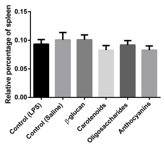 Relative weight of spleen compared to live weight (LW) did not show significant differences among treatments (Figure 2). Results were the following: control (saline): 0.100% of LW, control (LPS): 0.093% of LW, β-glucan: 0.100% of LW, carotenoids: 0.082% of LW, oligosaccharides: 0.091% of LW, anthocyanins: 0.082% of LW.