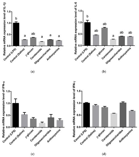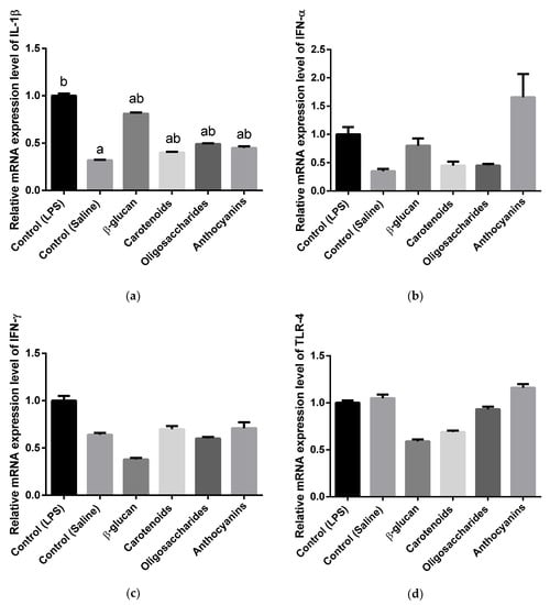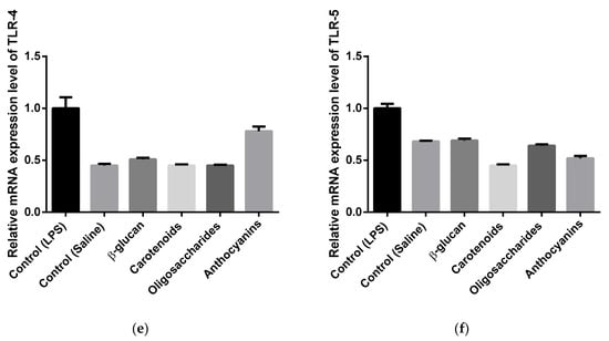 Relative mRNA expression levels in spleen are shown in Figure 3. The results showed that β-glucan had no significant effect on splenic cytokine mRNA expressions of broiler chickens. Carotenoids decreased splenic IL-1β (p = 0.0114) and IL-6 (p = 0.0325) gene expressions compared to the LPS injected control group, but none of the splenic IFN-α, IFN-γ and TLR-4 were influenced by the treatment under the challenge. IL-1β gene expression was also inhibited (p = 0.0497) by oligosaccharide supplementation. No significant effects were observed on chicken splenic IL-6, IFN-α, IFN-γ or TLR-4 by oligosaccharide supplementation. Anthocyanins resulted in decreased IL-1β level (p = 0.0303), but levels of other cytokines, such as IL-6, IFN-α, IFN-γ, TLR-4, TLR-5 did not differ significantly compared to the control (LPS) group.