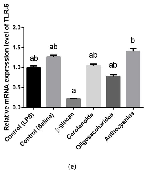 Relative interleukin-1β (a), interferon-α (b), interferon-γ (c), toll-like receptor 4 (d) and toll-like receptor 5 (e) mRNA expression in ileum of chickens fed basal diet under Escherichia coli LPS challenge, basal diet under isotonic saline challenge, diet supplemented with 0.05% β-glucan-, diet supplemented with 0.5% carotenoids-, diet supplemented with 0.5% oligosaccharides- and diet supplemented with 0.5% anthocyanins under Escherichia coli O55:B5 LPS challenge (n = 6/treatment). Error bars represent means ± standard errors of the mean. The effects were analyzed by One-way ANOVA and groups that do not share a letter are significantly different (p < 0.05).