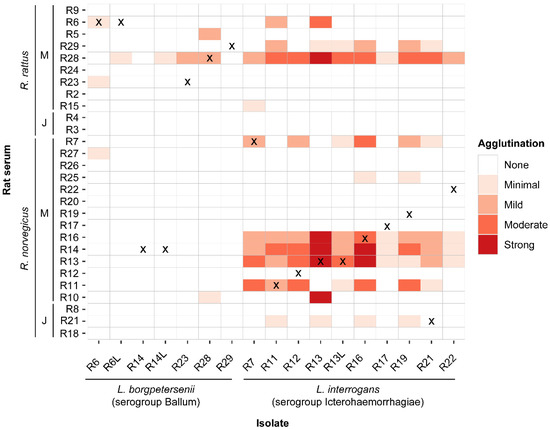 Cross-isolate MAT Assay. MAT response of individual rat serum and rat Leptospira isolates from this study. The X indicates the response of an individual rat to its own isolate. M = mature, J = juvenile.
