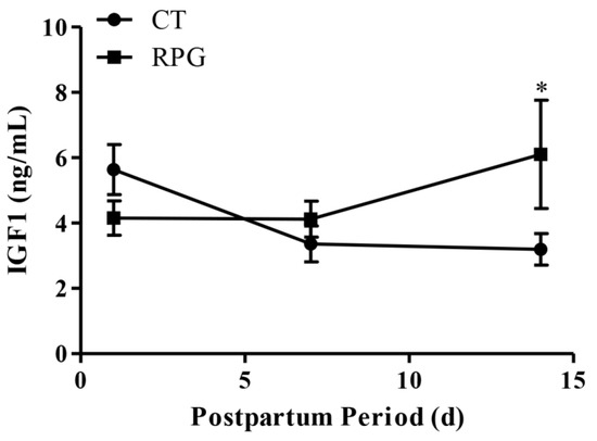 There were no significant differences (p > 0.05) regarding plasma IGF1 concentrations on 1 d and 7 d after delivery, but plasma IGF1 concentrations were higher (p < 0.05) in the RPG group on d 14 after delivery, compared to the CT group (Figure 1).