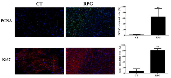 The RPG supplementation induced a significant (p < 0.01) increase in PCNA and Ki67-positive cells in the endometrium of cows on 14 d after calving (Figure 2).