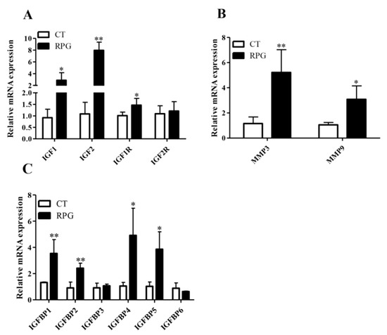 The endometrial IGFs (IGF1, IGF2 and IGF1R) and IGFBPs (IGFBP1, IGFBP2, IGFBP4 and IGFBP5) mRNA expression levels from the RPG group were significantly higher (p < 0.05) than those in the CT group, with trends towards increased IGF2R (p = 0.08) (Figure 3A,C). However, the mRNA expression levels of IGFBP3 and IGFBP6 were not changed significantly (p > 0.05) in the RPG cows versus CT cows (Figure 3C). The MMP3 and MMP9 gene expressions from RPG cows were significantly higher (p < 0.05) than those in CT cows (Figure 3B).