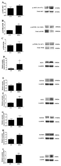 The endometrial protein expression of the ratio of p-AKT to total AKT and of p-mTOR to total mTOR increased (p < 0.05) in RPG cows versus CT cows (Figure 4A,B). However, the ratio of p-phosphatidylinositol 3-kinase (PI3K) to total PI3K did not change (p > 0.05) between the two groups (Figure 4C,G). The protein expression of IGF1, IGF1R, IGF2, IGFBP1, and IGFBP4 increased (p < 0.05) in the uterus of RPG cows versus CT cows (Figure 4D–F,H,I). No change (p > 0.05) in the protein expression of IGF2R was observed (Figure 4G).