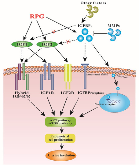 Proposed mechanism for RPG in regulating the uterine involution in post-natal dairy cows. The effect of RPG addition was mediated by both IGFs and mTOR/AKT signaling pathways. RPG addition might promote IGF1 and IGF2 binding to their respective receptors and enhance IGF-independent actions of IGFBPs, thereby activating the mTOR/AKT signaling pathway and accelerating the endometrial proliferation and repair. Each ligand displayed a specific binding affinity for the receptors: continuous arrows indicate high affinity, while dotted arrows and a red “X” indicates low affinity. The black dashed arrows are currently unknown.