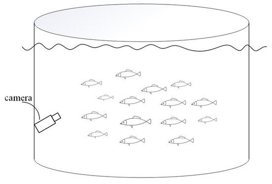 Experimental video data were collected from the “Deep Blue No. 1” far offshore mariculture net cage located in the Yellow Sea of China, and were provided by Wanzefeng Fishery Co., Ltd., Rizhao, China. The fish farmed in the cages were adult Atlantic salmon, and videos of Atlantic salmon were collected underwater. The collection camera takes pictures of fish from the bottom up and forms a certain angle with the water surface to avoid the influence of vertical light on the acquisition. Figure 1 shows the collection diagram. The captured video has a resolution of 1920 × 1080 and a frame rate of 60 fps. Sequence images are extracted from the video data, frame by frame. In this experiment, no fish was harmed by stress, and the collection was conducted under conditions that did not affect its normal growth. The experiment did not involve animal ethical issues.