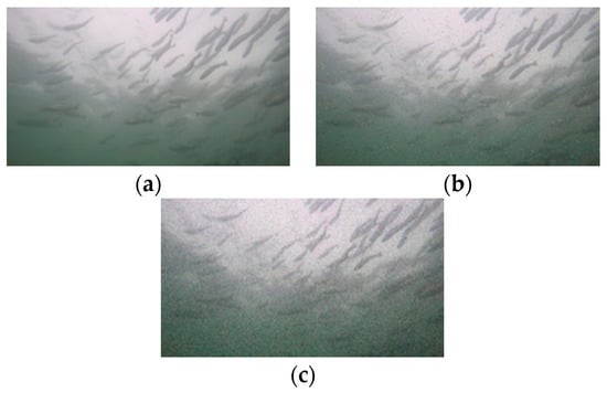 After image enhancement, 1501 original images were selected as the dataset. The original images are 1920 × 1080. In reducing the network input, the images are uniformly converted to 1280 × 720 pixels. Moreover, Gaussian noise and salt-and-pepper noise (as shown in Figure 3) with a variance of 0.001 are added to the original images to expand the dataset and increase the robustness of the network model [31].