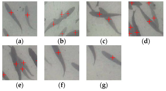 The final dataset includes 6004 frames of original images, enhanced images, Gaussian noise images, and salt-and-pepper noise images. It is challenging to determine each fish’s position and the number of a fish shoal by labelling the same part of the fish. Therefore, the center of the fish is labelled (Figure 4a) in this study. For partially occluded fish, the center position of the largest exposed part is labelled as far as possible (Figure 4b–e). Approximately half of the fish body appears in the image (Figure 4f), while a small part of the fish body appearing in the image is not labelled (Figure 4g). Each label records the position of the corresponding fish, and the number of labels corresponding to the image indicates the number of fish in the shoal; thus, each label is a sample of the dataset.