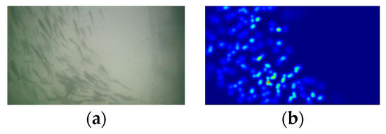 Inspired by crowd counting, we follow the method of crowd density estimation to achieve fish counting. Detection [32] and regression [33] are the two main methods used for crowd counting. Methods based on detection use a sliding window to detect objects one by one. This method has difficulty detecting partially occluded objects, and its performance is poor in crowded scenes. Regression methods calculate the number of specific objectives by learning the relationships among image features, which solves the problem of counting in large-scale crowded scenes. However, regression ignores the significance features, leading to inaccurate prediction in local areas. The density map [34] overcomes the shortcomings of the above two methods. It retains the local feature information and can obtain more fish distribution information while ensuring an accurate estimation.