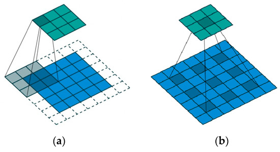 Figure 7a corresponds to a dilated convolution with kernel size 3 × 3 and dilation rate r = 1, which is the same as the standard convolution. Figure 7b corresponds to the dilated convolution with kernel size 3 × 3 and dilation rate r = 2; however, the actual convolution kernel size is still 3 × 3. For the 5 × 5 receptive field, only points are convoluted with the 3 × 3 kernel, and the remaining points are skipped. The size of the receptive field is 5 × 5; however, only 9 points have non-zero weights, and the remaining points are zero. Although the convolution kernel is only 3 × 3, the receptive field has been expanded to 5 × 5. The dilated convolution expands the perception range without losing more information. Thus, the output of each convolution contains a more extensive range of information.