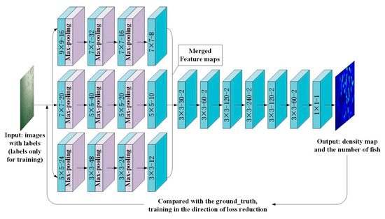 In this study, the front end of the proposed model is based on the MCNN [27], therein using a multi-column CNN to capture the feature information of different-sized receptive fields. Each column of the CNN uses a convolution kernel of different size to adapt to the changes in the fish body size and individual differences caused by fish swarm movement. The front end branches use three pooling operations. The back end uses dilated convolution instead of a pooling-convolution structure to reduce the loss of spatial structure information. Moreover, we deepen the network to mine more in-depth information. When the object is the same size as the receptive field, it is better to use more convolution layers and smaller convolution kernels [40]. Therefore, the convolution kernels of the back end are set to 3 × 3 and the dilation rate is 2. Considering a single underwater scene, to reduce the parameters of the network model, the network is not set as wide as visual geometry group-16 (VGG-16). In the last layer, the convolution layer is used instead of the fully connected layer such that the input image can be any size. Figure 8 shows the structure of the proposed model. The inputs are images with the labels (labels only for training), the final outputs are the corresponding density map and the number of fish.