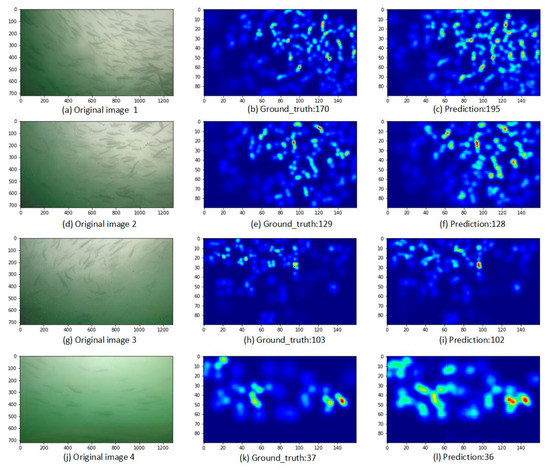 Finally, high-quality fish shoal density maps were generated using the trained model, as shown in Figure 10. Because the front end branches use three-times pooling operations, the length and width of the final generated density map become 1/8 those of the original, and the overall size is 1/64 that of the original. Figure 10 shows one group of relatively poor results (Figure 10a–c) and three groups of relatively good result (Figure 10d–l), one of which contains only a few objects (Figure 10j–l). Except for the counting results, the four groups of predicted density maps are in good agreement with the ground truth, which can overall reflect the distribution of fish shoal.