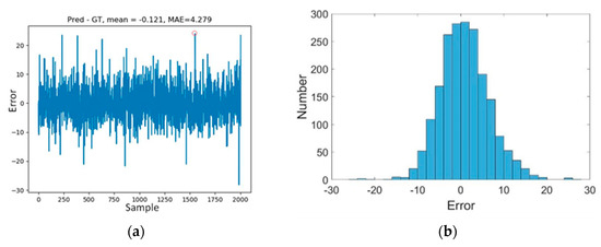 (a) Results of model test and (b) histogram of error between ground truth and the estimation.