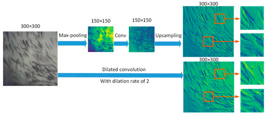 In this study, dilated convolution [41] was used to retain more spatial structure information. Compared with the pooling+convolution+upsampling operation, dilated convolution has apparent advantages when keeping the size of the feature map unchanged. To further explain its principle, this article visualizes the process of extracting feature maps via convolution and dilated convolution. Taking Figure 12 as an example, the original input fish shoal image is processed by two different methods to generate a feature map of the same size. In the convolution method, the 2 × 2 max-pooling was used for downsampling, and then, a 3 × 3 convolution kernel was used to perform the convolution operation. Because the length and width of the generated feature map become 1/2 of those of the original images, upsampling must be used to restore the feature map to the original size. The dilated convolution method directly uses dilated convolution with a 3 × 3 kernel size and dilation rate of 2 to generate the same-sized feature map. There are 64 channels in both convolutions. Figure 12 shows that the feature image generated by the dilated convolution contains more detailed information (enlarged part). It shows that dilated convolution can be used as an alternative to a pooling-convolution structure, which simplifies the network structure and reduces the loss of more details.