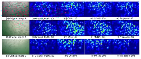 Figure 13 shows a comparison of the density maps generated by different models; Figure 13a,f,k are the original images; Figure 13b,g,l are the corresponding ground truth density maps; Figure 13c,h,m are the corresponding density maps generated by the CNN; Figure 13d,i,n are the corresponding density maps generated by the MCNN; Figure 13e,j,o are the corresponding density maps generated by the proposed model. Figure 13 shows that the density map generated by the proposed model has more detailed information and is most consistent with the ground truth. However, there are still problems with the density map. The image is relatively fuzzy, the distinction between individuals is not apparent; it is also difficult to observe more details. These are problems to be solved in the future.