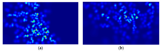 where is the average distance between the label and its nearest k labels, and is an adjustable parameter based on reference [27]. The estimated density map generated by the model needs to be compared with the ground truth. The resulting error loss is propagated back to the network so that the training can be carried out in the direction of decreasing loss. The accuracy of the label directly affects the quality of the model training. Figure 6 shows the density map generated using adaptive Gaussian convolution kernel.