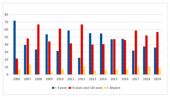 Frequency distribution of equids with age categories: <3 years, >3 years and <20 years and >20 years old (n = 1510) over the study period (2006–2019).