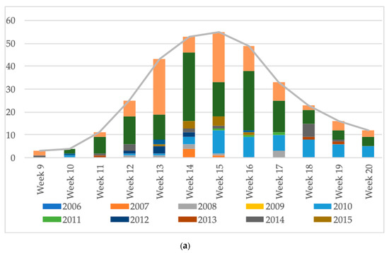 As previously reported, cases of AM occur more frequently in autumn (76%; n = 1801) than in spring (24%; n = 570). The expressions “autumn” and “spring” should not be taken stricto senso, since the autumnal clinical series are continuing in early winter and some spring cases are occurring after the 21 June. It is worth noting that 94% of “spring” cases occurred between the 1 March and the 31 May and 94% of “autumnal” cases occurred between the 1 October up to the 31 December (Figure 3a,b).