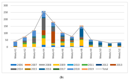 (a). Spring cases: weekly occurrence of atypical myopathy cases from week 9 (1 March) up to week 20 (31 May) over the study period (2006–2019); (b). Autumnal cases: weekly occurrence of atypical myopathy cases from week 41 (1 October) up to week 52 (31 December) over the study period (2006–2019).