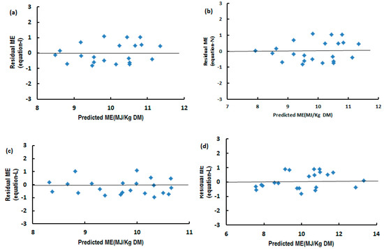 The Lin’s concordance correlation coefficient (Rc) was used for further verification of differences between predicted and actual values using equations developed in the present study and by previous authors [3,15,16,19,26,27,28,30]. The results are presented in Table 7 and Table 8, respectively. The residual differences between predicted and actual ME values for some present equations are presented in Figure 1. They all recorded a high agreement in Rc between predicted and actual ME values. The scatter of differences between predicted and actual values was smaller for the equations developed by using digestibility parameters and nutrient concentrations as predictors (Figure 1).
