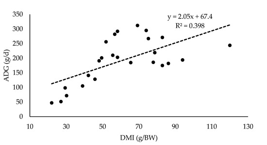 Figure 1 presents the relationship between dry matter intake and average daily gain (ADG) in treatments on lambs fed only fresh forage [33,42,63,64,67,70,73,74].