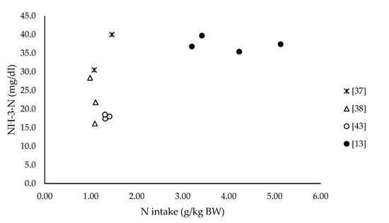 Pasture supplementation with TMR (mixture of forage and concentrates) appears as a strategy that can improve the uptake of N-ammonia and improve microbial protein synthesis on a forage-based diet in cattle [116]; but in sheep, this approach has been little explored. Our group evaluated different levels of fresh forage supplementation to a total mixed ration (TMR) (0, 0.50, 0.75, and only fresh forage) in lambs. We observed that the ruminal pH and ammonia concentration increased as the inclusion of forage in the diet [37]. On the other hand, when cereal grains were replaced by corn by-products combined with fresh forage provided for 8 h per day, rumen pH and ammonia decreased, but the microbial protein synthesis did not change [38]. Figure 2 shows the relationship observed in several studies of our group between N intake and rumen NH3-N in lambs fed forage, forage plus concentrate, or TMR. Ruminal NH3-N concentration does not seem to be related up to a certain level of N intake.