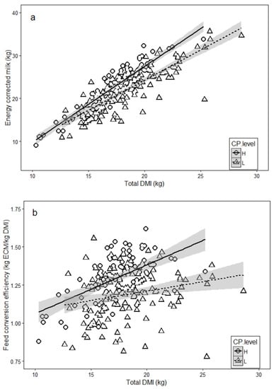 Relationship between energy corrected milk (ECM); (a) or feed conversion efficiency (b) and total dry matter intake (DMI) by lactating dairy herds on 43 grazing system dairy farms at low (L; <20%) and high (H; >20%) dietary crude protein (CP).