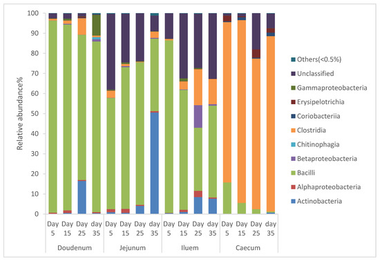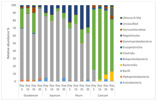 From Figure 1, it can be seen that the diversity of the bacterial community in the intestinal segments of broiler chickens changed from one age period to the next. Species that exhibited an abundance less than 0.5% in all samples were classified into “others”. The intestinal segments of duodenum, jejunum, and ileum had a higher relative abundance of Bacilli, and as the birds aged, the percentage of Bacilli decreased, whereas the cecum had a higher relative abundance of Clostridia and as the birds aged, the percentage of Clostridia increased.