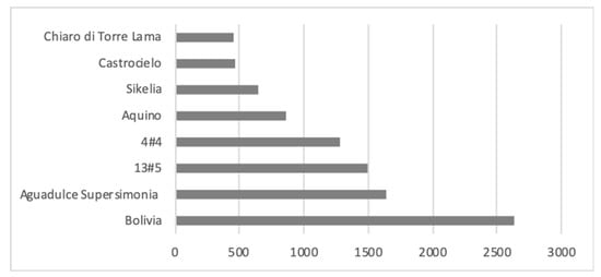 Comparing the weights, which referred to 1000 seeds (Figure 1), it was possible to highlight that all the analysed varieties showed characteristics corresponding to the specific botanical typology: Chiaro di Torre Lama, Castrocielo and Sikelia weighed less than 700 g, corresponding to the minor type; the Aquino varieties showed a weight of 856 g, corresponding to the equina type while all the remaining varieties showed weights higher than 1000 g. The weight of the Bolivia variety (2633 g) was particularly high.