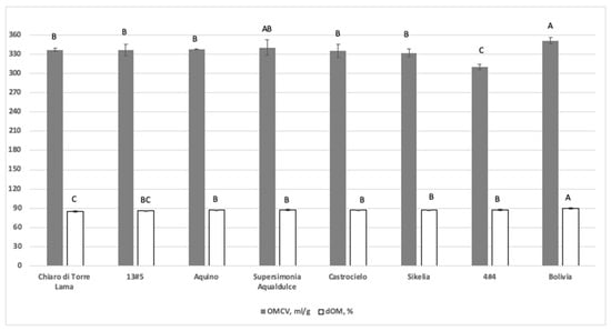 In vitro fermentation characteristics of faba bean varieties; dOM = organic matter degradability (% of incubated OM; p = 0.0007); OMCV = cumulative volume of gas related to incubated OM (mL/g; p = 0.0004). For each parameter: A–C = p < 0.01. Error bar = standard deviation.