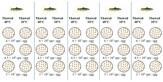 The fertilization trial was performed on March 5, 2019. Pooled eggs from two females were divided into batches of 106 ± 8 eggs, using 34 glass laboratory jars: four jars were fertilized using excess fresh semen at the beginning and at the end of the fertilization trial (control groups) in order to test the quality of the eggs; and 30 jars were divided into six treatment groups. Each treatment group was fertilized using semen of the individual males (n = 5) thawed at 40 °C or 10 °C with three different spermatozoa-to-egg ratios (6 × 105:1, 4.5 × 105:1 and 3 × 105:1), as shown in Figure 1. Before adding the semen, 5 mL of fertilization solution D532 (20mM Tris, 30 mM glycine, 125 mM NaCl, pH 9.0) [12] was added to the eggs. The sperm was gently mixed with the eggs for 10 s, and then about 20 mL of hatchery water was added. After 2 min, the eggs were washed with hatchery water and placed in an incubator with running water at about 10 °C, where they developed until the eye stage (after ~25–30 days from fertilization). Unfertilized and dead eggs were counted and removed twice a week. The fertilization success was established by calculating the percentage of embryos at the eyed stage, using the initial number of eggs (number of eyed eggs × initial egg number-1 × 100).