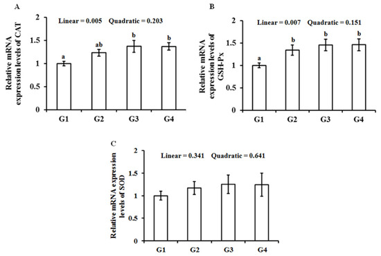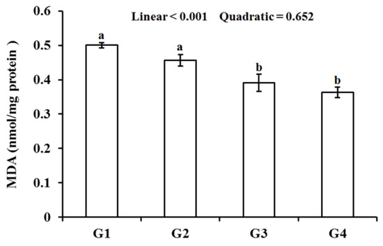 | CAT (U/mg protein) | 2.115 a | 2.340 a b | 2.874 a b | 3.105 b | 0.146 | 0.007 | 0.991 |