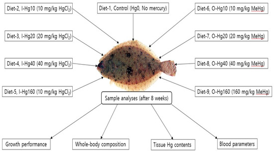 Feed formulation and proximate composition of the basal feed is shown in Table 1. Nine semi-purified diets were manufactured in order to contain 50.0% crude protein and 10.0% crude lipid. Four of the diets were formulated to contain 10 (I-Hg10), 20 (I-Hg20), 40 (I-Hg40) or 160 (I-Hg160) mg of inorganic mercury (Hg)/kg diet in the form of mercuric chloride, HgCl2 (Sigma-Aldrich, St. Louis, MO, USA); four diets were prepared to contain 10 (O-Hg10), 20 (O-Hg20), 40 (O-Hg40) or 160 (O-Hg160) mg of organic Hg/kg diet in the form of methylmercury, MeHg (Sigma-Aldrich, St. Louis, MO, USA), while one diet was formulated to contain no mercury (Figure 1). We used dietary casein and fish meal as the sources of protein, as well as wheat flour, dextrin, and corn starch as the sources of carbohydrates; and fish oil as the source of lipid. In this study, the inclusion rates of dietary organic and inorganic mercury were selected based on the previously reported dietary experiment on mercury by Lee et al. [39].