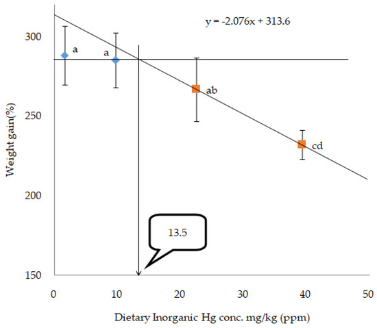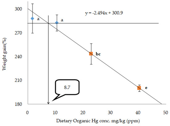 In conclusion, according to the broken-line regression model for percentage of WG, the threshold/optimum toxicity level of a mercury-incorporated diet for juvenile olive flounder could be 13.5 mg Hg/kg in terms of HgCl2 and 8.7 mg Hg/kg in terms of MeHg, respectively. This study has novel implications for further study on the mechanisms of toxicity and its detoxification by different antioxidants at different temperatures in the marine fish model.