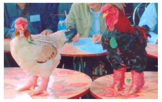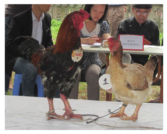 Large body weight is one of the least advantageous factors in Vietnam’s commercial’s market because Vietnamese consumers prefer small size chickens [9]. This raises questions with respect to the presence of these large size breeds. As mentioned earlier, the Ho and the Dong Tao were historically the two breeds used as gifts for the King [11]. Most likely, their large body weight was one of the important criteria for their selection as a royal gift [8]. A traditional festival used to take place each year to select the most beautiful individual from the Ho breed and the owner of the best bird was always awarded a prize. This festival is still taking place every year. According to morpho-biometric criteria, the body weight index is very important in that respect [11,15].