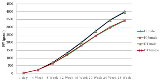 Growth performance of Ho and Dong Tao chickens, H: Ho breed, DT: Dong Tao breed.