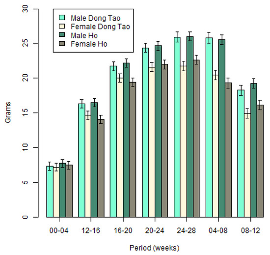 Sex and age had effects on the growth (p < 0.0001), with heavier males than females and weights increasing with age. The interaction between sex and age demonstrated a clear difference in the growth in both sexes (p < 0.001): Starting from similar weight up to week 4 (p > 0.05), the weights start to diverge and become different (p < 0.0001) from week 8 onwards. We did not observe any main breed effect (no global differences between Ho and Dong Tao individual weights, p > 0.05), nor any differences between the weights in the two breeds with time (comparison at the various time points all provided non-significant differences, p > 0.05). Within each sex, the growths were also similar (the sex*age*breed interaction was not significant (p = 0.7769), and comparisons of males (or females) from the 2 breeds at different ages did not produce any significant differences). Nevertheless, we found a slight (p = 0.0182) interaction between breed and sex: the weight of Ho males was slightly higher than the weight of Dong Tao males, while the opposite was true for females (although these two differences are not significant). Figure 3 summarizes these results.