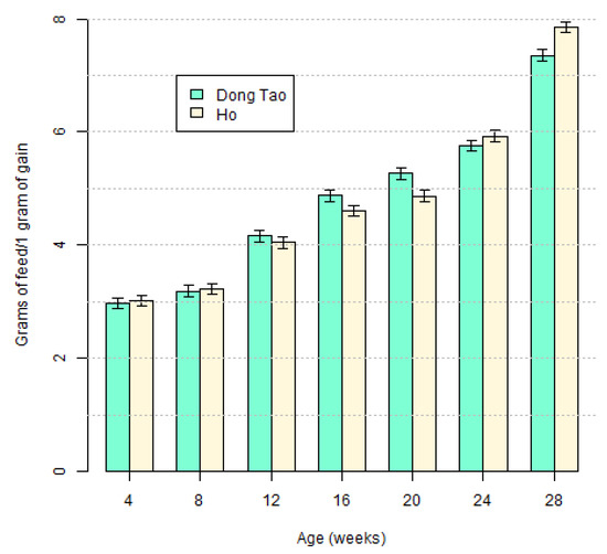 Considering the entire testing period, the FCR of Ho and Dong Tao broilers were very similar, with only few minor differences. Comparing these results to similar results from other breeds shows how inefficient Ho and Dong Tao are, even when compared to indigenous breeds [20,23]. As can be expected, the native breeds have slower growth performance and poorer feed conversion ratio than hybrid broilers [24,25].
