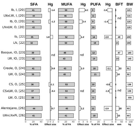 Fatty acid composition of subcutaneous adipose tissue of local vs. modern pig breeds and within-study effect size (Hedges’ g) [27]. Studies were carried out in different conditions (including body weight, backfat thickness) and should be interpreted accordingly. Effect size (Hedges’g) [27] is considered to be medium if it is above 0.5 or below −0.5 and large if it is above 0.8 or below −0.8. In the case of Reference [20], the effect size for the inner and outer backfat layer was calculated separately. SFA = saturated fatty acids; MUFA = monounsaturated fatty acids; PUFA = polyunsaturated fatty acids; Hg = Hedges’ g; BFT = backfat thickness; BW = body weight; I = inner back fat layer; O = outer back fat layer; FA = fatty acids composition; Ib = Iberian pig breed, LN = Landrace; LW = Large White; Pi = Piétrain; CS = Cinta Senese; nd = calculation of Hedges’g was not possible due to missing data.
