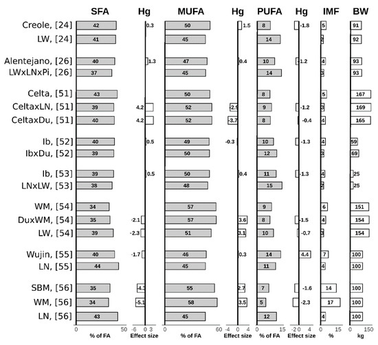 In agreement with a higher genetic capacity to deposit IMF, local breeds generally exhibit an increased proportion of SFAs and MUFAs, along with decreased PUFAs proportions. In comparison to modern pig breeds, the differences were in (in regard to the effect size) small to large (i.e., 0.3–5.1), as was demonstrated for Iberian, Creole, White Mangalitsa, Swallow-bellied Mangalitsa, Alentejano and Wujin local pig breeds (Figure 2) [24,26,51,52,53,54,55,56]. In accordance with our assumptions set for subcutaneous fat (i.e., a higher de novo synthesis and desaturation ability), most of the local pig breeds exhibited higher MUFA and lower PUFA contents compared to local pig breeds. Crossbreeding of local pig breeds with modern pig breeds also affected the IMF fatty acids composition, although the effect may be breed-dependant. The proportion of MUFA was higher in crossbreeds than in local and modern pig breeds during the crossing of Celta with the modern breed Landrace, which significantly affected the proportion of MUFA (effect size = 2.9), especially for oleic acid. Similarly, crossing the Duroc breed with Celta also affected the proportion of MUFA (effect size = 3.7) [51]. However, crossing Mangalitsa with Duroc had no significant effect on SFA and MUFA proportions in longissimus dorsi muscle [54].