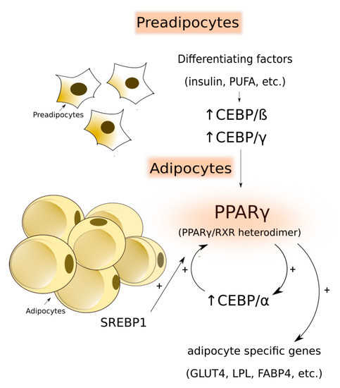 Briefly, an increase in the adipocyte number is controlled by many adipogenic stimuli, including insulin, glucocorticoids, dietary PUFA and other differentiating factors, which determine whether adipocytes will start to differentiate or remain quiescent [76]. Initial differentiation starts with a decreased expression of several genes, which is typical for preadipocytes like CCAAT/enhancer-binding proteins (C/EBPß and C/EBPγ), which are activated in response to adipogenic stimuli and induce the expression of the central adipogenic factor peroxisome proliferator-activated receptor gamma (PPARγ) [77,78]. Its signaling pathway promotes fatty acid oxidation, synthesis of triglycerides in adipocytes and causes an increase in adipocyte volumes [62,79]. In the terminal stages of adipogenesis, heterodimer PPARγ induces the expression of another CAAT/enhancer-binding protein - C/EBPα, which is binding on the PPARγ promoter site and positively regulates PPARγ expression [78], and thus ensures maintenance of the differentiated state of the adipocytes [74]. Moreover, sterol regulatory element-binding proteins (SREBP) are also involved in the regulation of PPARγ expression [80]. Some other genes, like lipoprotein lipase (LPL), fatty acid-binding proteins (FABP) or glucose transporter type 4 (GLUT4) bind in their promotor region PPARγ or C/EBPα transcription factor, resulting in activation of the protein translation [62].