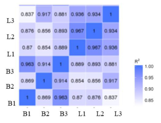 Sample-level correlation between transcriptome samples. Note: In the figure, B represents the breast muscle and L represents the leg muscle; R2: the square of Pearson’s correlation coefficient.