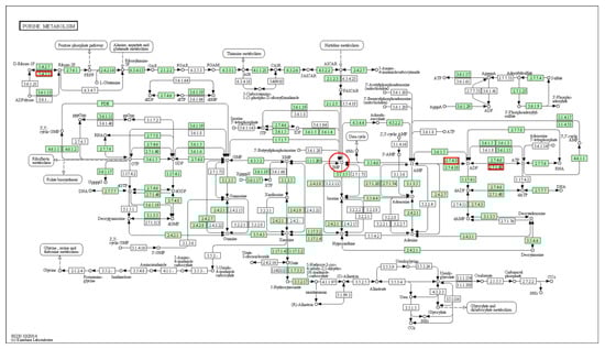 Location of differentially expressed genes (indicated by red boxes) in the purine metabolic pathway.