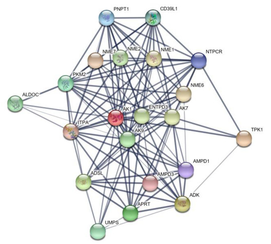 The results of our interaction network analysis of the differentially expressed AK1 gene are depicted in Figure 4. The circles (nodes) shown in the figure represent the differentially expressed protein. Circles containing illustrations indicate that the gene has an associated protein structure, whereas empty circles indicate that the protein structures have not been determined for the gene. The figure shows that AK1 and protein interact with 20 other genes, notably the two major enzymes ADSL and AMPD1 involved in purine synthesis.